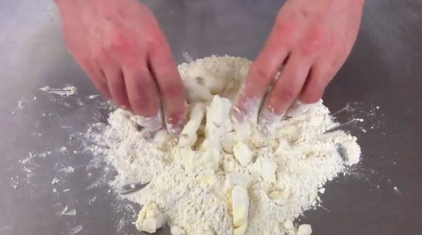 - Cut cold butter into small cubes and toss them with the dry ingredients (flour, salt, and sometimes sugar).