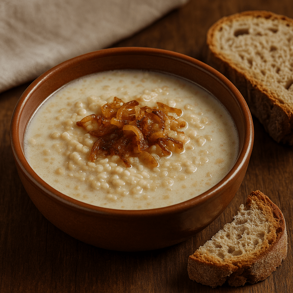 A staple of the Pontic table, especially in the highlands of the Black Sea, where bulgur (korkoto refers to uncooked bulgur) and yoghurt were kitchen essentials. It’s a soup of balance: grain and dairy, earth and tang, simplicity and nourishment. A drizzle of browned butter with golden onions completes it, turning something humble into a focal, favourite and soothing meal.